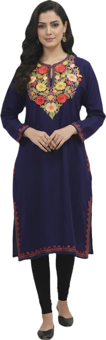 BATIN Kashmiri Pheran, Floral Embroidered Woolen Pheran, Women Tunics, Indian Kurtis, Fine Merino Wool 42 Count (Raffal) P...
