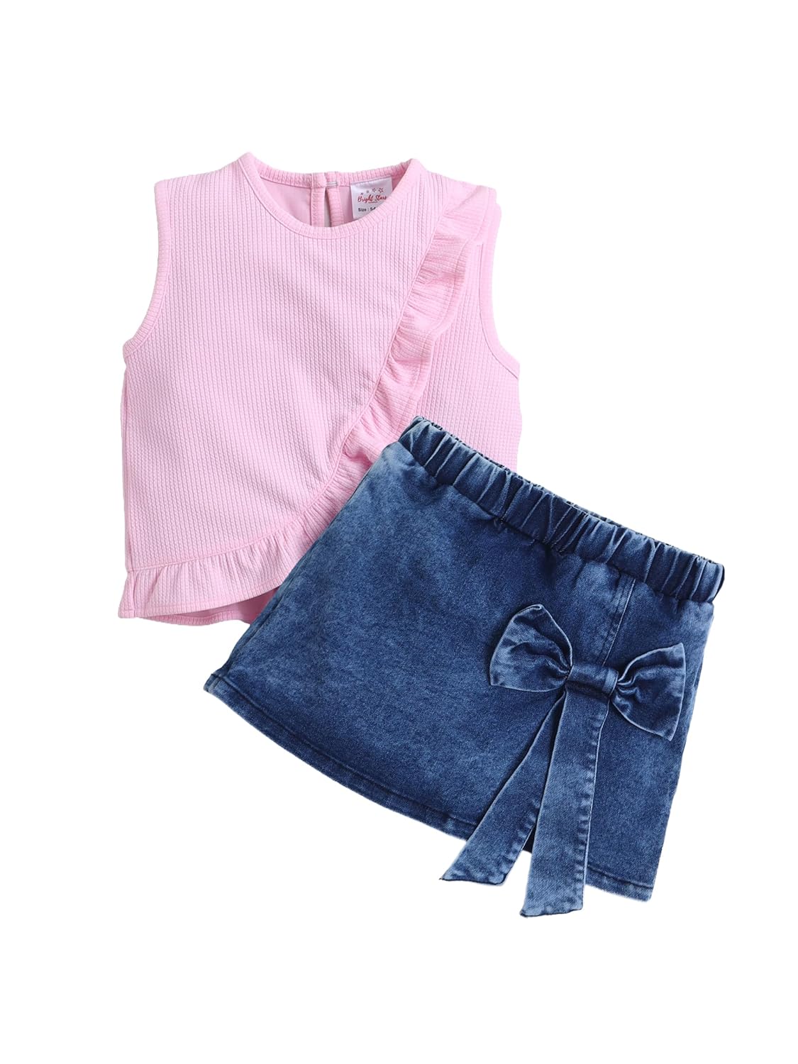 BRIGHT STARS KIDSWEAR Girls Top & Skort Co-Ord Set, Ruffle Sleeveless Top with Denim Wrap Skort, Stylish Two Piece Outfit,...