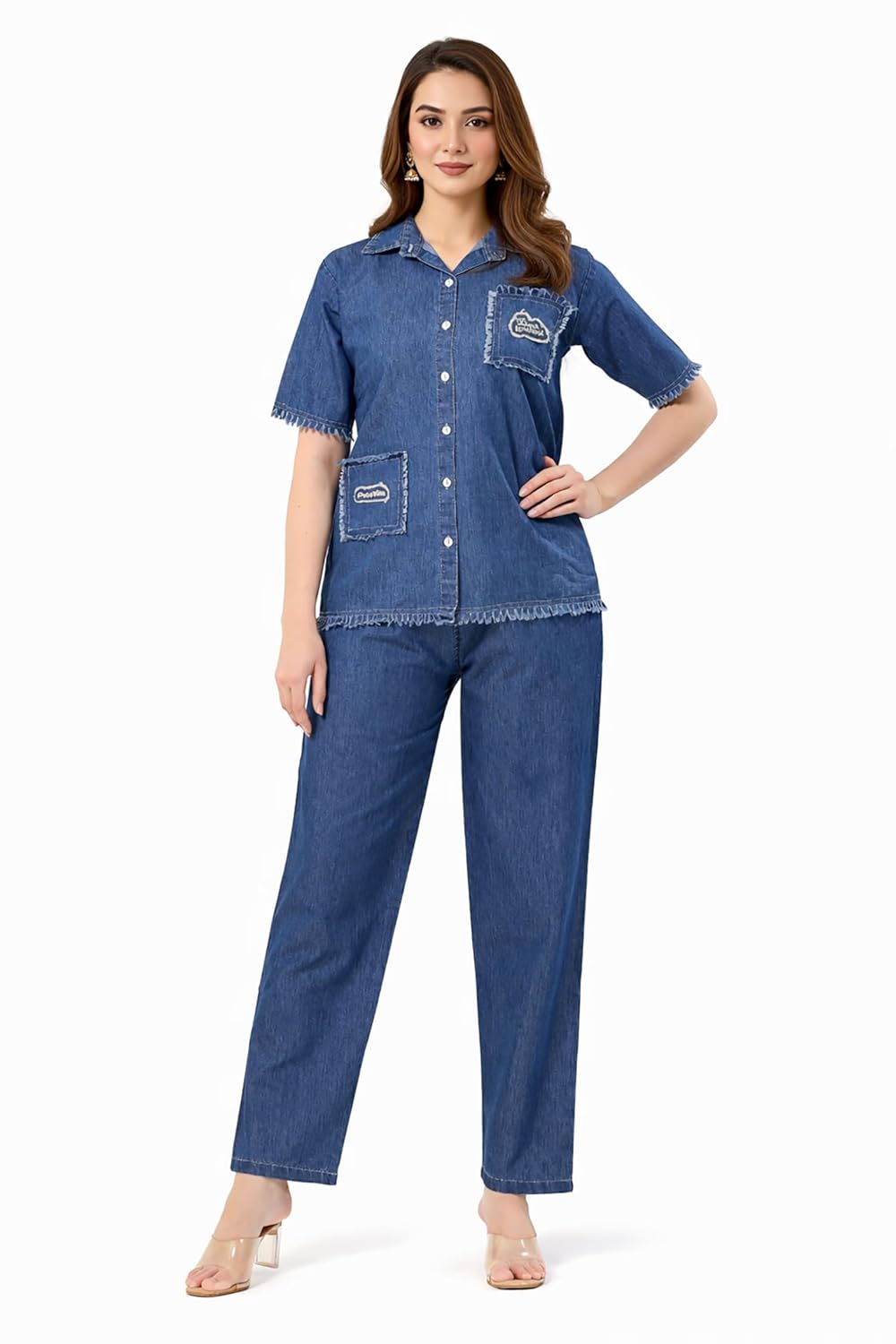 Co ord Set for Women Solid Denim Short Kurta Pant Set | V-Neck Straight Blue Kurta Pant Set | Cotton Denim Co ord Set for ...