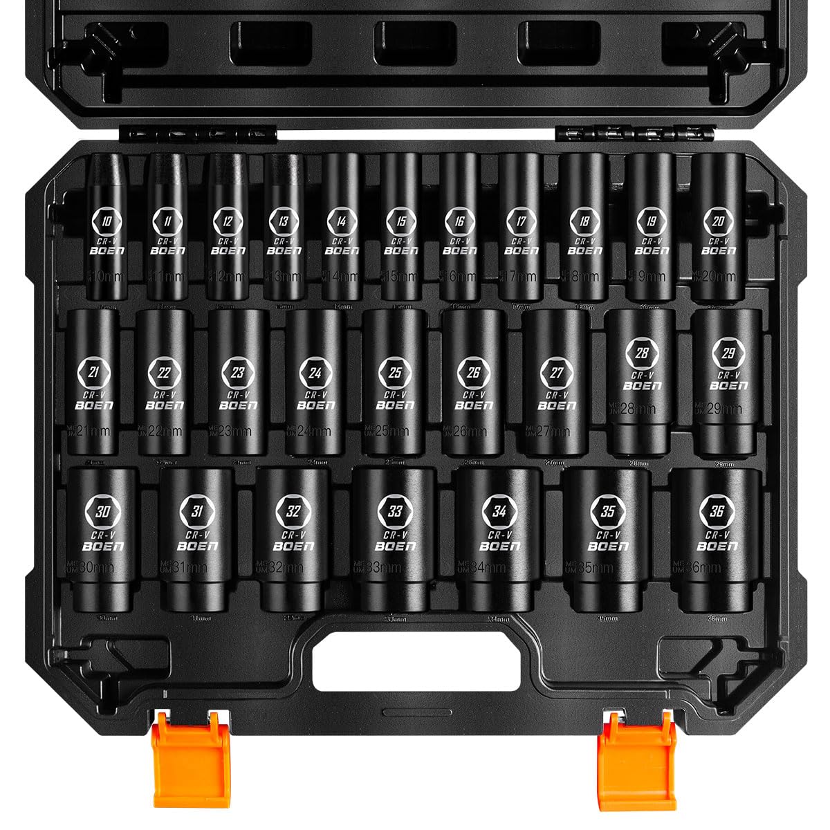 boen 10mm-36mm 1/2” Drive Metric Socket Set, Impact Deep Socket, 6-Point Axle Nut Socket with Portable Case, Rugged Constr...