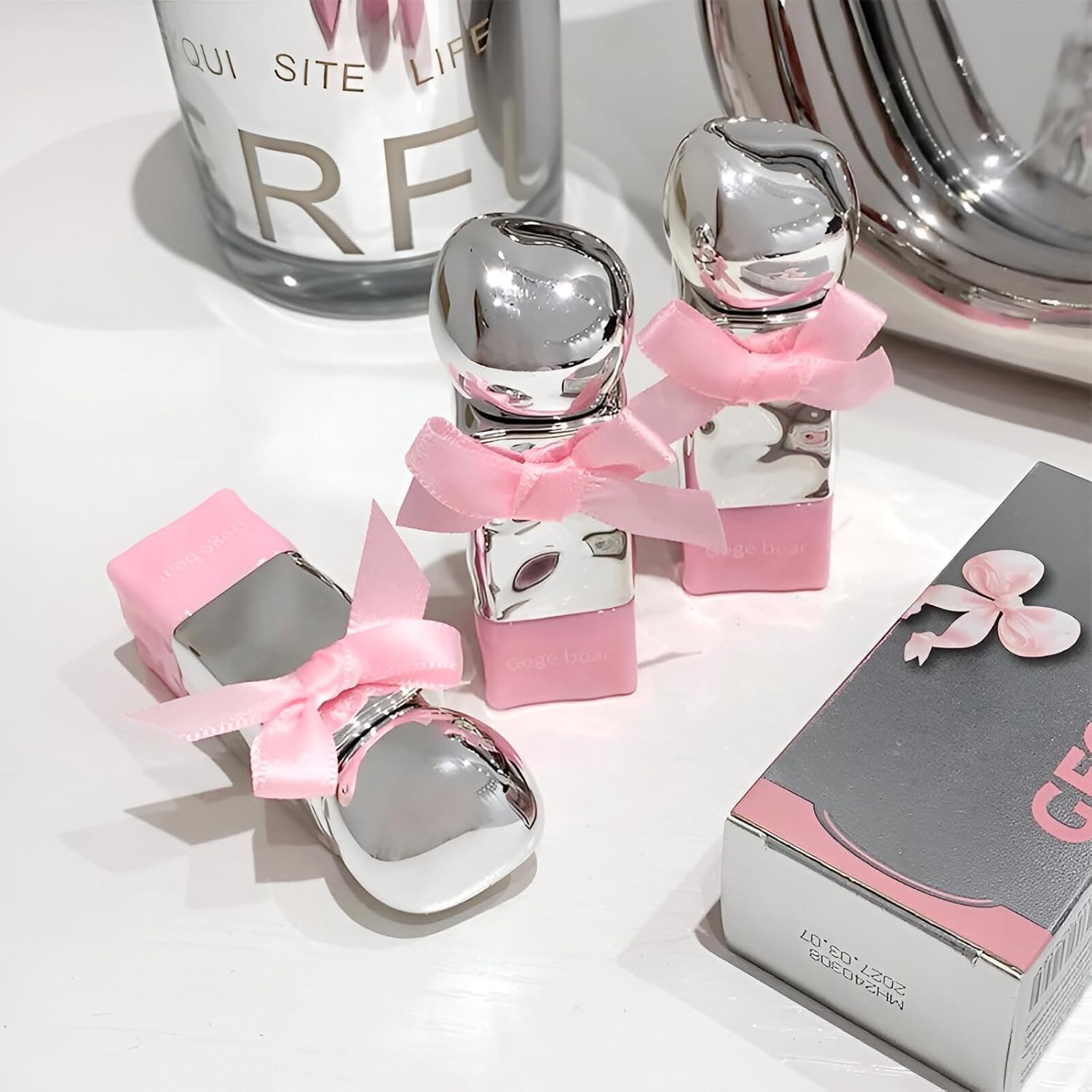 Gege Bear Sweet Tender and Moist Water Lip Glaze – High-Pigment, Long-Lasting Cute Bear-Shaped Cap with Pink Bow Lip Gloss...