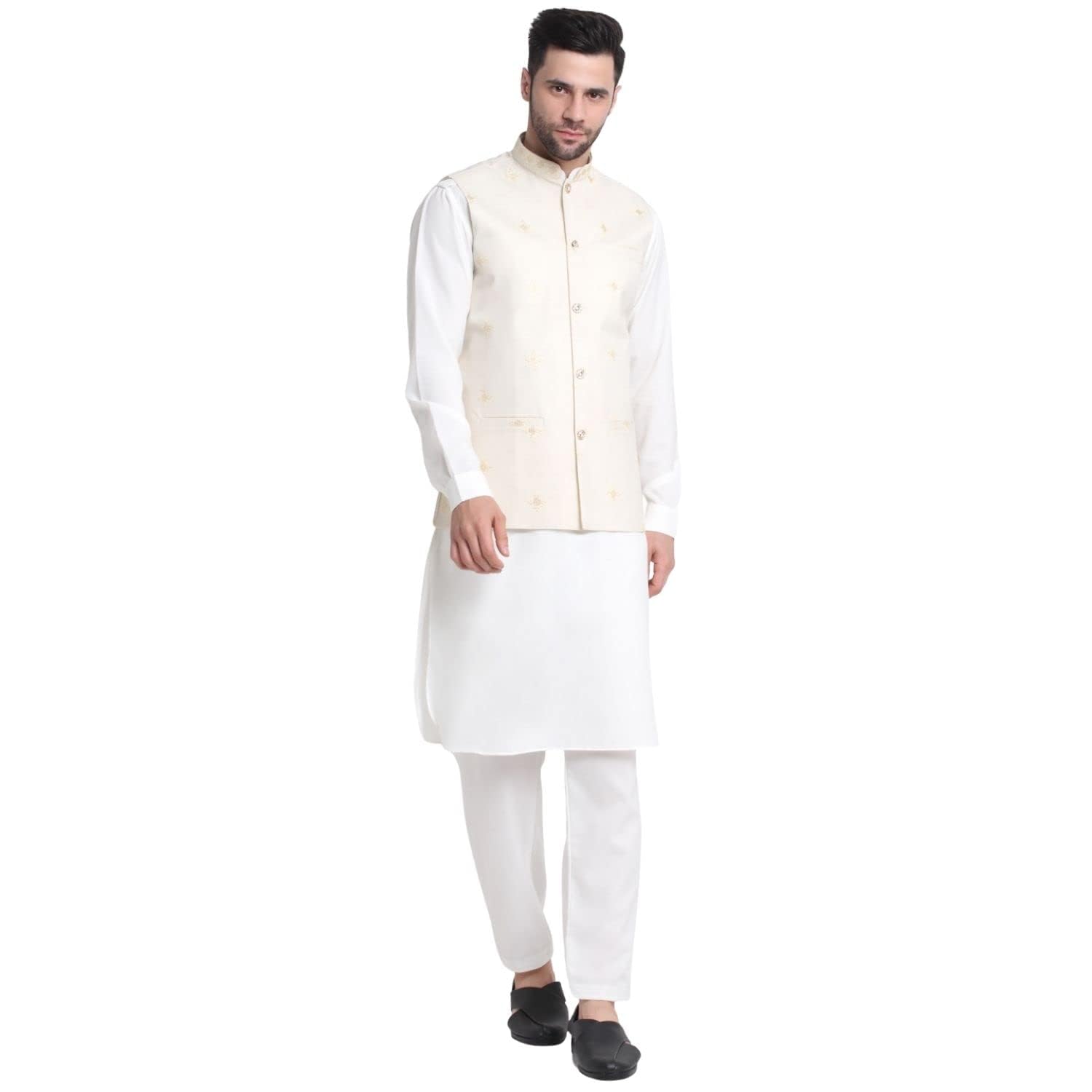 KRAFT INDIA Men's Cotton Blend Solid Kurta and White Elastic Waistband Pyjama With Cotton Embroided Sequenced Nehru Jacket