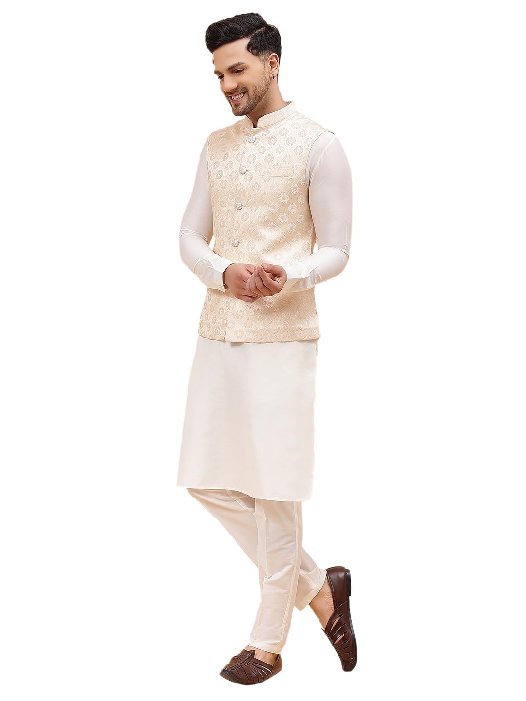 Choosing the right Mens Clothing product is important, and See Designs Men Off White Kurta Pajama & Gold Woven Design Jacquard Nehru jacket stands out because of its trusted performance and reliability. It is suitable for beginners as well as professionals, making it a versatile choice for various needs.