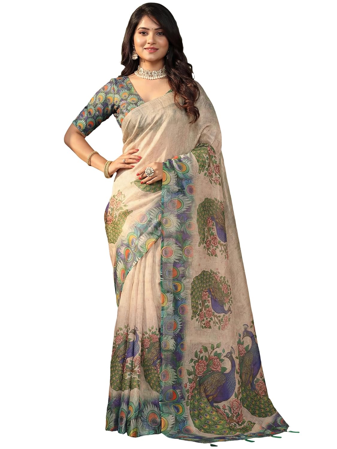 Sidhidata Women's Cotton Linen Blend Lining Digital Printed Saree With Unstitched Blouse Piece (Linen Lining Saree)