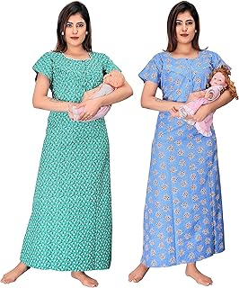 Ankona Cotton Feeding Nighty COMBO in Mix Cotton with Two Side Zips for Baby Feeding Purpose and Neck Buttons For Comforta